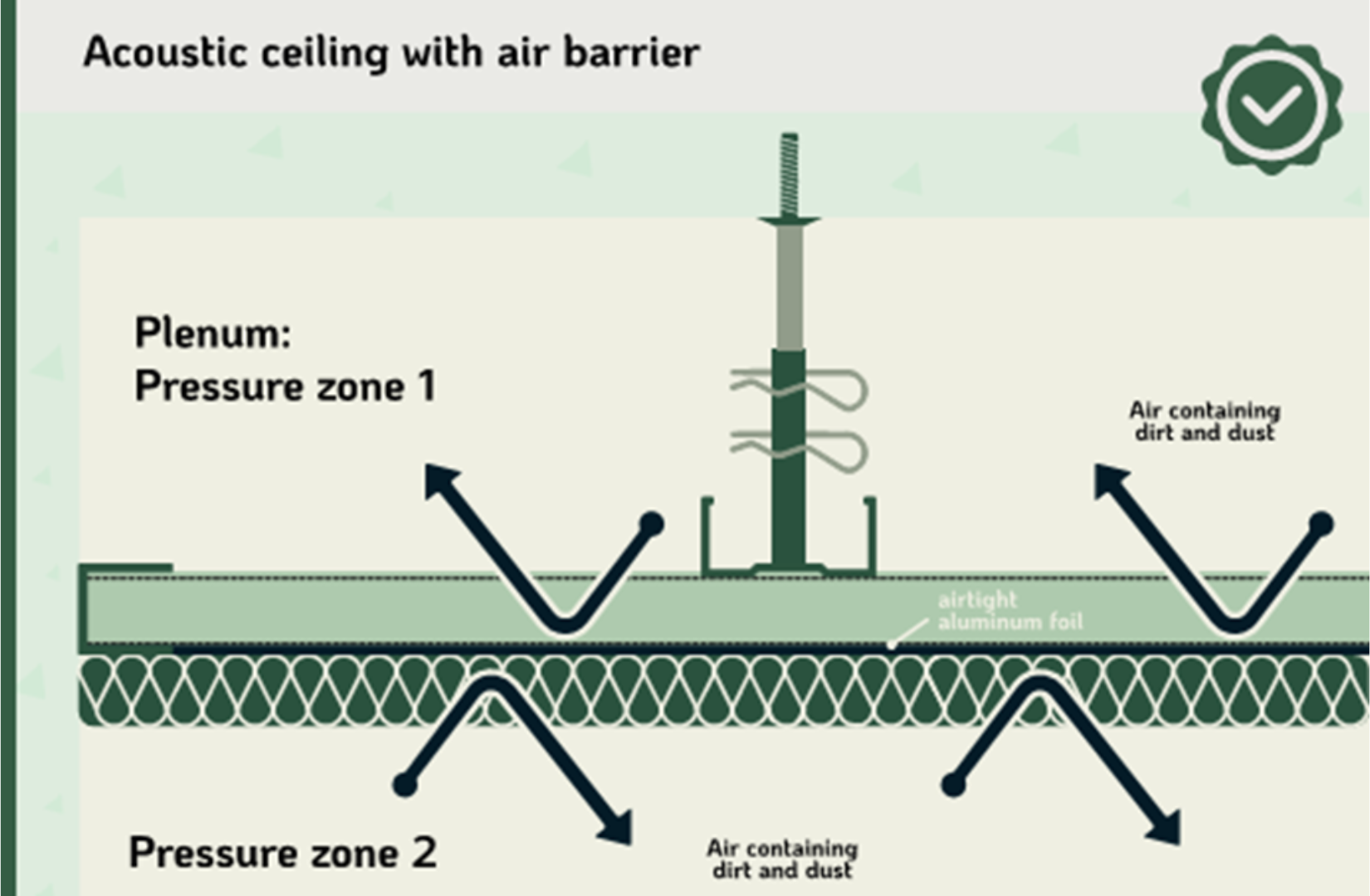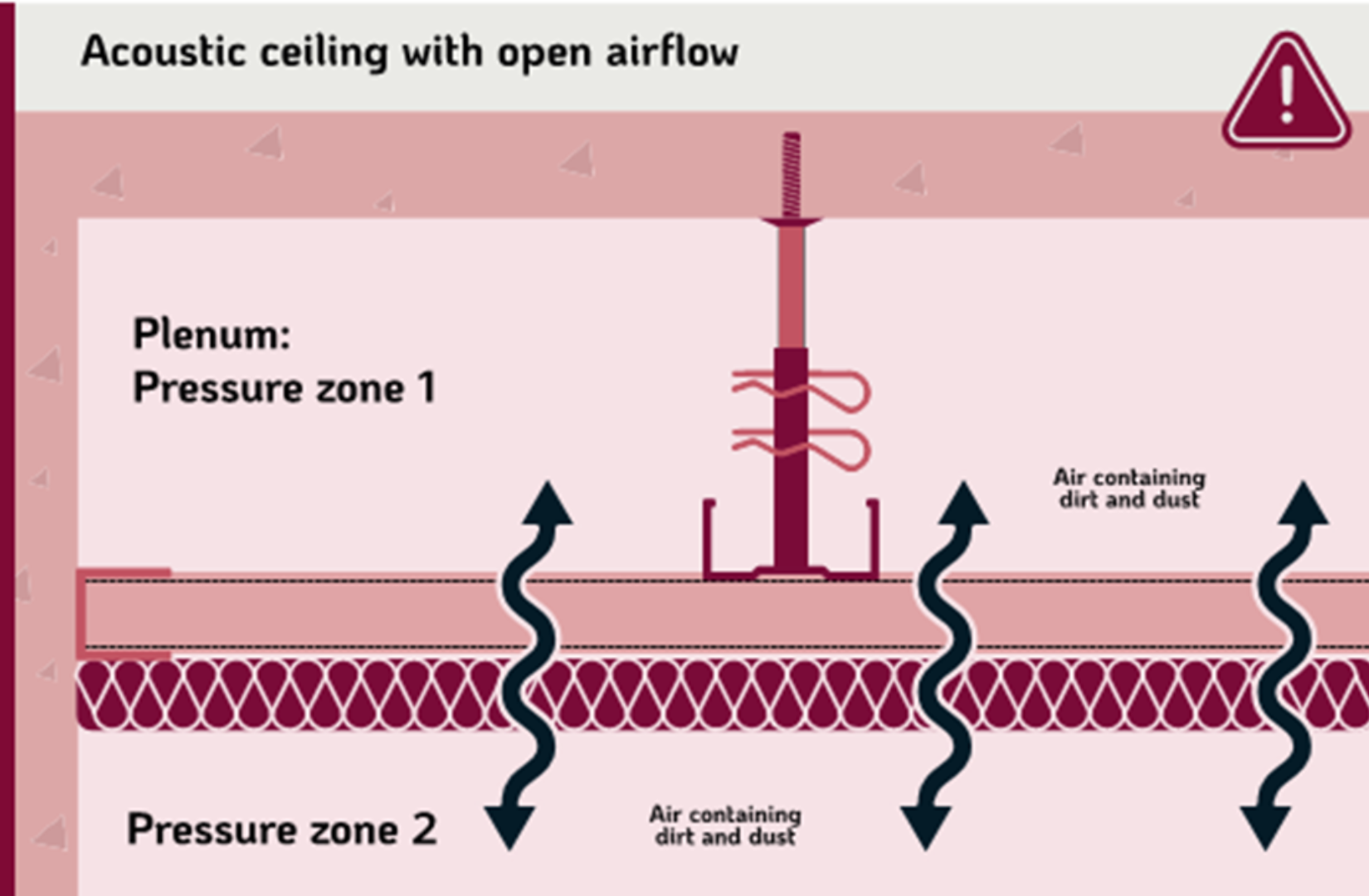 Volgens de TBA-richtlijn kan vervuiling ontstaan door drukverschillen tussen boven- en onderzijde van het plafondoppervlak. Om dat zoveel mogelijk te beperken, moet de druk aan beide zijden zo veel mogelijk gelijk blijven. Voor een duurzaam mooi plafond zijn dus niet alleen akoestische prestaties belangrijk, maar ook de juiste opbouw, verwerking en detaillering.