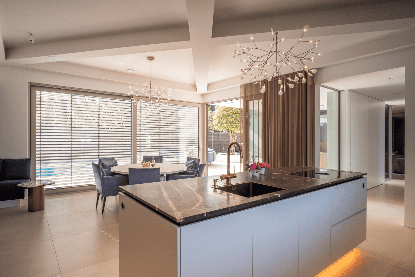 Voortzettend in de woonkamer, verlengt het akoestische plafond zijn functionele elegantie en biedt het kalmte. Het design integreert naadloos met het interieur, terwijl het de geluidskwaliteit verhoogt, het gesprek verrijkt en de luisterervaring zuivert. Door de toepassing van een naadloos akoestisch plafond is de ambiance van elke bijeenkomst of ontspannen avond verfijnd. Dit project weerspiegelt een verbintenis aan zowel akoestische perfectie als esthetische integriteit, waarmee de woonruimte zich onderscheidt als een toonbeeld van modern wooncomfort.