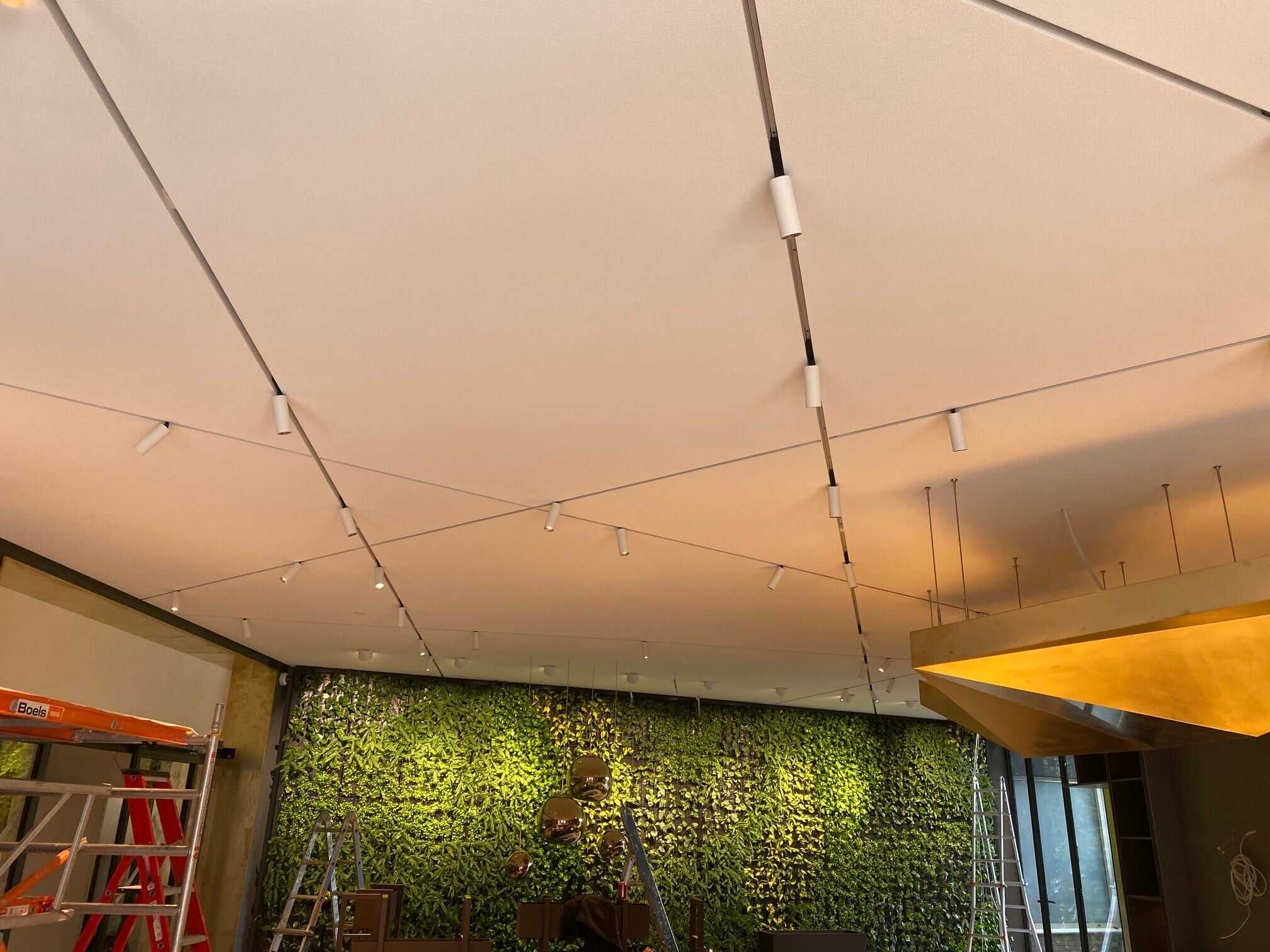 Uniek naadloos akoestisch plafond met 200m¹ ingebouwde spanningsrails op exact dezelfde hoogte van het plafond. Het prachtige ontwerp is verzorgd door OTH Architecten. To Build gunde aan Pennings Akoestisch Afbouwen de opdracht om de volledige akoestiek te verzorgen in dit kantoor.