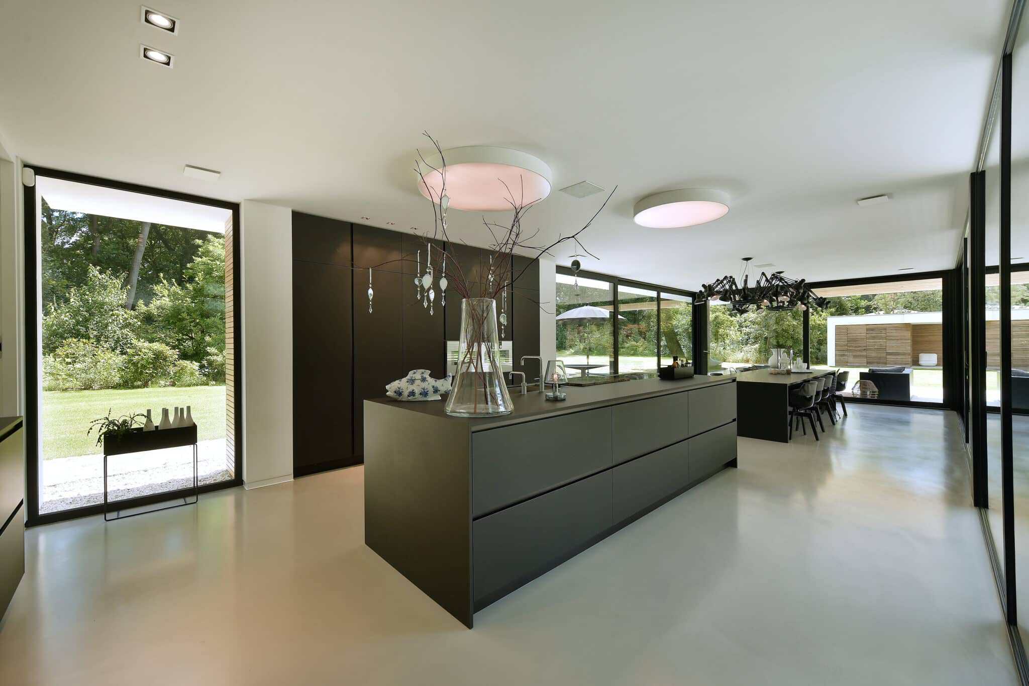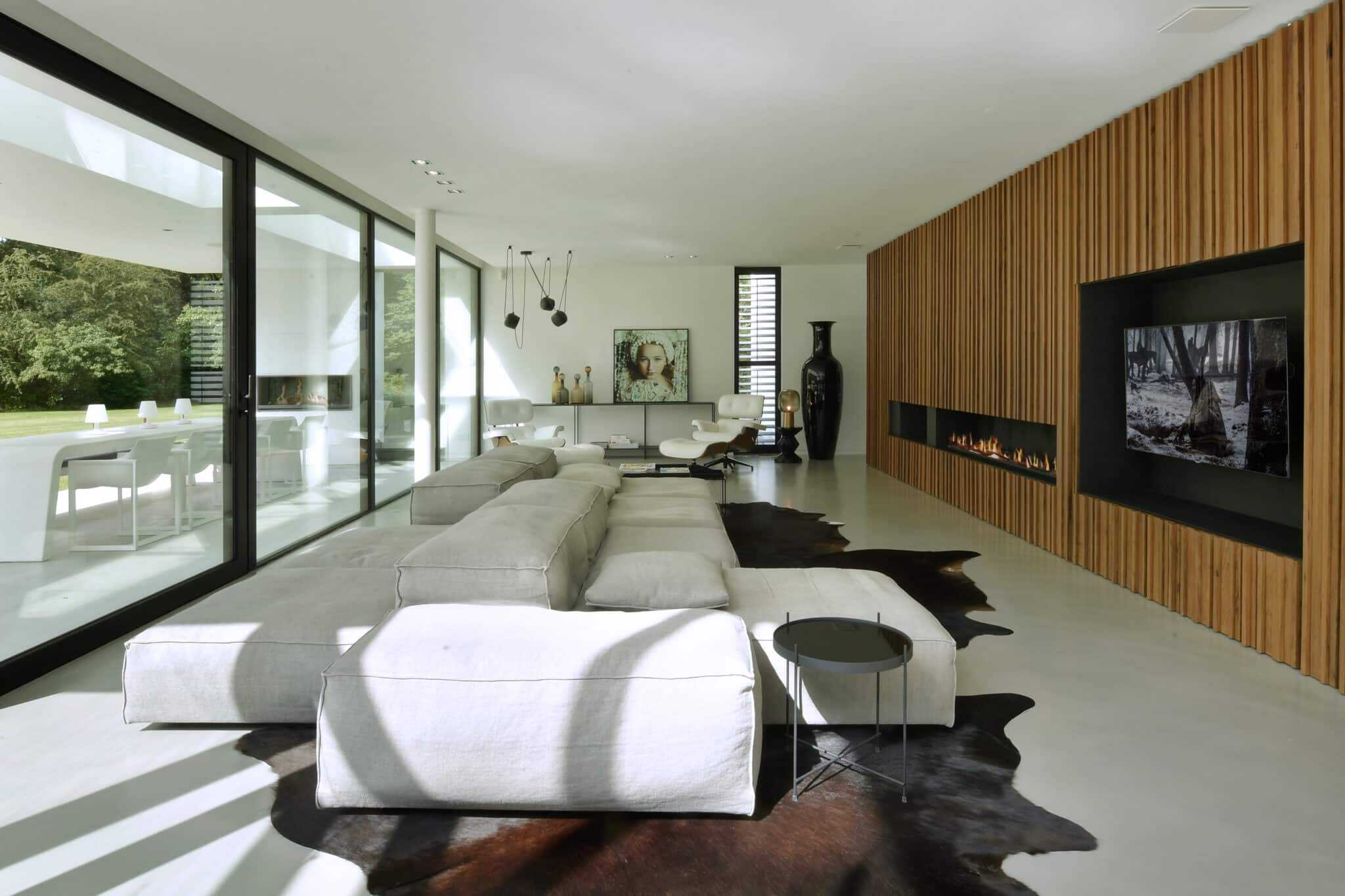 Lab32 architecten heeft hier een mediterrane villa getekend, door alle harde oppervlakte en minimalistische inrichting vraagt het om akoestische problemen. Dit is voorkomen door de toepassing van een naadloos akoestisch plafond met een absorberende werking van 95%.